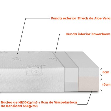 Colchón Viscoelástico 10+5: Perfecto para camas nido, ofrece 15 cm de firmeza y confort. Su viscoelástica de 55 kg/m³ se adapta al cuerpo, aliviando presiones. Incluye doble funda lavable con tratamientos Sanitized y Aloe Vera. ¡3 años de garantía para un descanso higiénico y duradero!