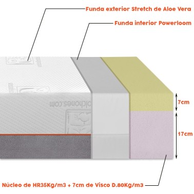 Colchón viscoelástico de 24 cm con núcleo bicapa y visco de alta densidad, que alivia la presión y mejora la postura. Ofrece una sensación envolvente, temperatura estable y descanso profundo desde la primera noche. Funda higiénica con Aloe Vera, tratamiento antibacteriano y diseño transpirable, fácil de mantener y compatible con cualquier base.