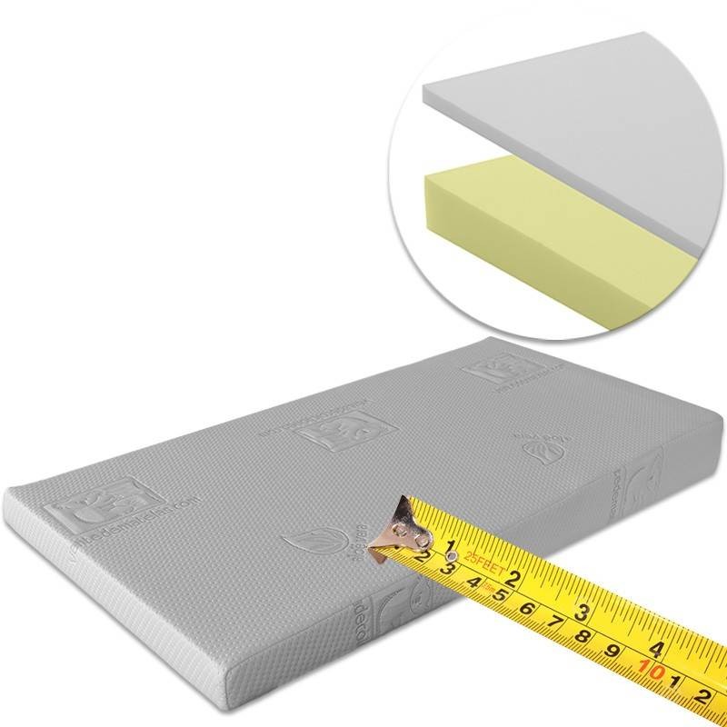 El núcleo de 10 cm está compuesto por una plancha de poliuretano de 20 kg/m³, indeformable y duradera, con opción a añadir 3 cm de viscoelástica (55 kg/m³) para mayor adaptabilidad. Estos materiales regulan la temperatura corporal y mantienen la ventilación óptima, permitiendo que el bebé duerma boca abajo sin riesgos y reduciendo la posibilidad del síndrome de muerte súbita. El colchón está fabricado con pegamento al agua, libre de sustancias tóxicas, y cuenta con una funda desenfundable en tejido Stretch de 438 g/m² con tratamiento Ultimate Freshness y Aloe Vera, que protege contra bacterias, ácaros y moho.