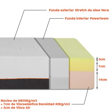 Colchón de alta gama con triple capa viscoelástica y 25 cm de grosor que combina firmeza, adaptabilidad y sensación de ingravidez. Su diseño transpirable alivia puntos de presión y favorece un descanso fresco y reparador. Incluye funda lavable con Aloe Vera y tratamiento antibacteriano, compatible con todo tipo de bases y camas articuladas.